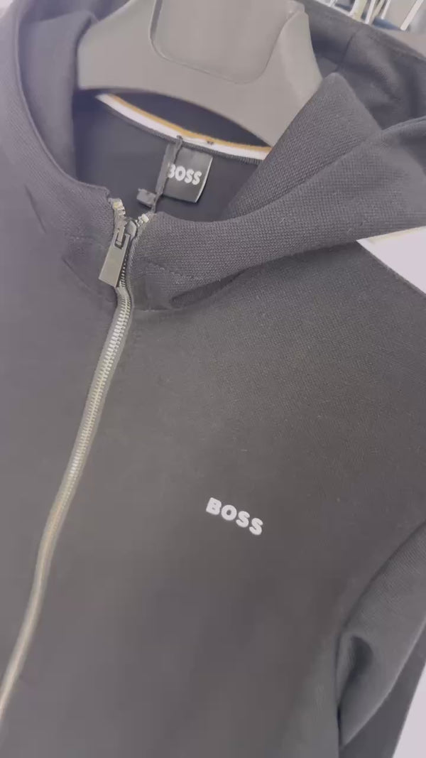 Férfi BOSS melegítő, ekrü fekete csíkokkal.